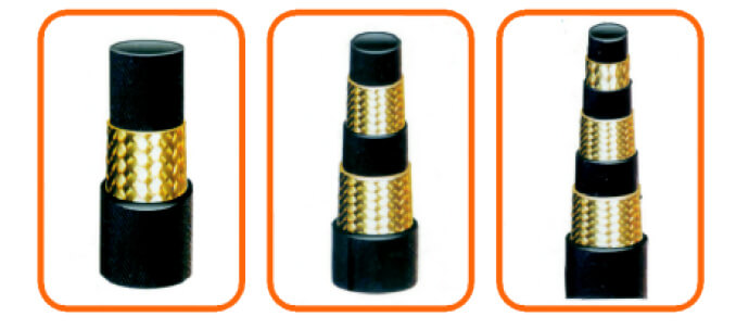 高壓鋼絲編織膠管結構是由耐液體的合成膠管內膠層、中膠層、Ⅰ或Ⅱ層或Ⅲ層鋼絲編織增強層及耐氣候性能優(yōu)良的合成橡膠外膠層組成。